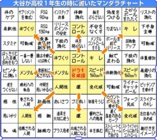 その形状から「マンダラチャート」とも呼ばれています。 それを見ると、かならずしも野球の技術や体力についてばかりではなく、「運」や「人間性」も条件として挙げています。さらにその要素には、「感謝」「思いやり」「あいさつ」「本を読む」など。